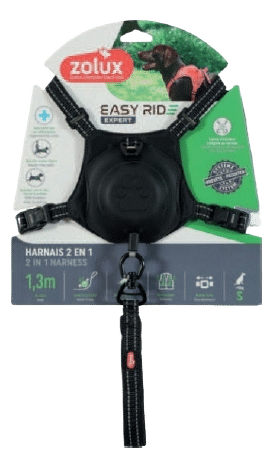 Le harnais EasyRide est équipé d’une laisse enrouleur intégrée de 1,3 mètres, poignée incluse avec doublure néoprène, offrant un contrôle total lors des sorties du chien, ainsi que la possibilité de le lâcher sans avoir à garder la laisse en main.