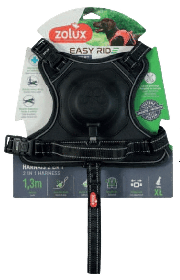 Le harnais EasyRide est équipé d’une laisse enrouleur intégrée de 1,3 mètres, poignée incluse avec doublure néoprène, offrant un contrôle total lors des sorties du chien, ainsi que la possibilité de le lâcher sans avoir à garder la laisse en main.