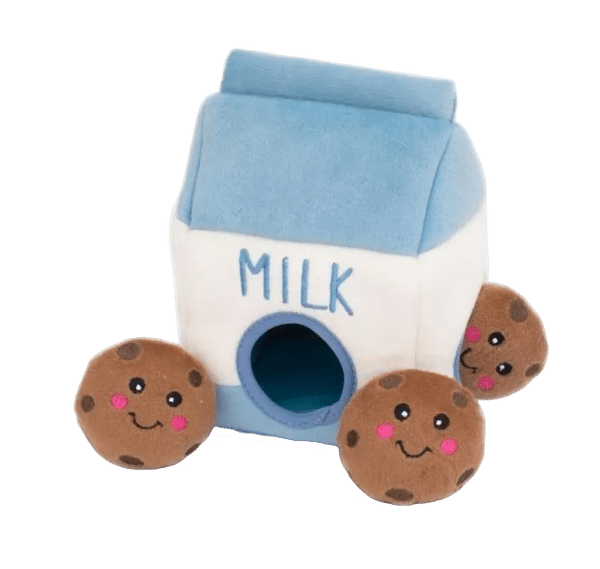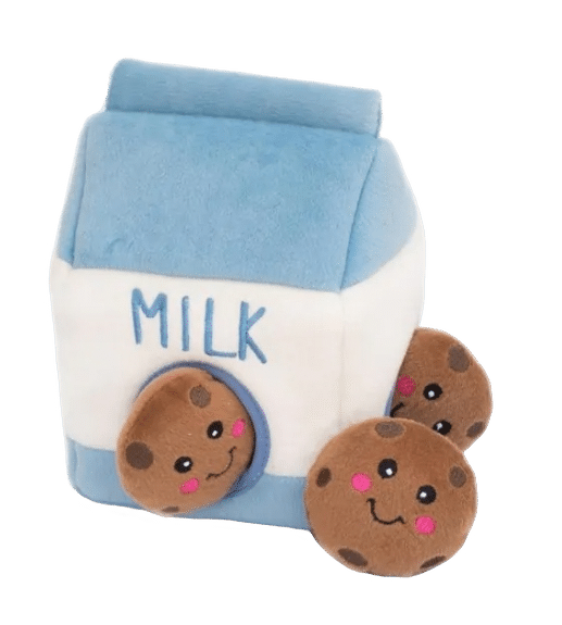 On connaît tous le combo lait et cookies… mais avez-vous déjà vu votre chien en profiter à sa façon ? Votre compagnon pourra plonger dans sa boîte de lait pour retrouver ses trois petits cookies qui couinent ! Dès qu’il les aura sortis, il vous regardera avec ses yeux suppliants pour que vous les cachiez à nouveau… encore et encore !
