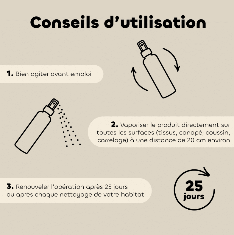 Pour garantir l’efficacité du spray, vous pourrez reproduire l’opération tous les mois après utilisation.