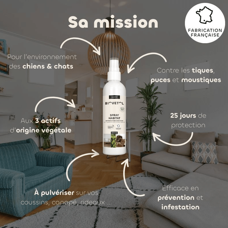 Et si vous pouviez transformer votre maison en un oasis de sérénité ? C’est possible grâce au spray Habitat Biovetol conçu à partir d’actifs d’origine végétale. En l’utilisant, vous montrez la porte aux puces et aux tiques, sans oublier les tiques, acariens, araignées, blattes, et autres créatures à six ou huit pattes. Votre coin de paix est désormais simplement protégé.